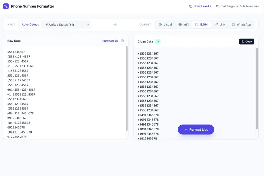 Format phone numbers into consistent, professional styles for websites, ads, or contact lists. Supports bulk formatting to save time on large lists.